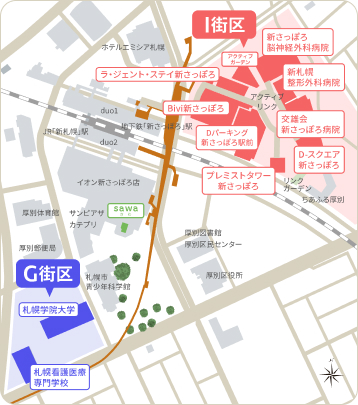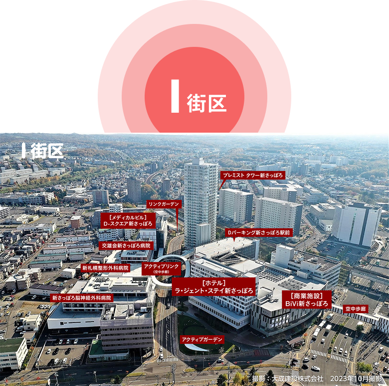商業施設や宿泊施設、健康な生活を支える予防医療や専門医療・地域医療、タワーマンション、子育て支援施設が集積。屋内空中歩廊「アクティブリンク」により、安全な歩行者動線を確保します。さらに、D-スクエア新さっぽろのB1F・1Fには「エネルギーセンター」を設置。低炭素で災害に強い街を目指し、I街区全体に電気と熱エネルギーを供給します。